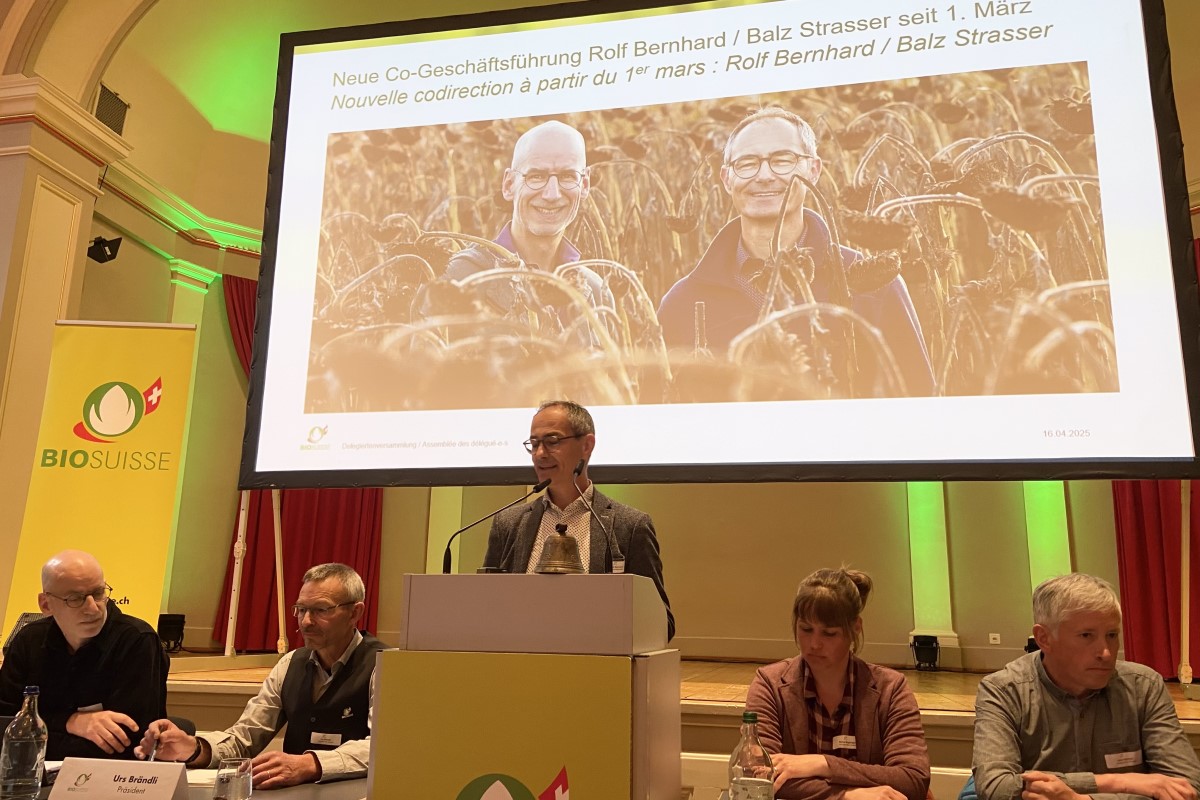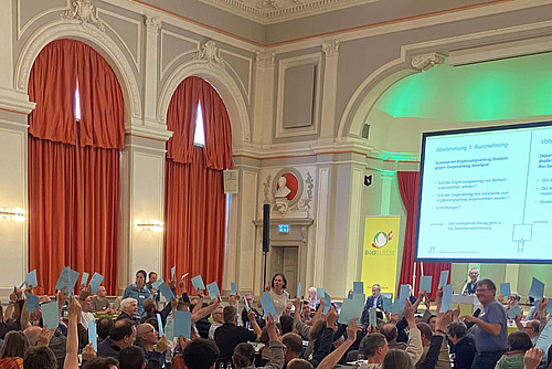 Für angeregte Debatten sorgte ein Antrag der Mitgliedorganisation Biofarm. Hintergrund des Antrags ist der wachsende Umsatz mit Bio Produkten in der Schweiz, der aber hauptsächlich auf Importprodukte zurückzuführen sei. Aus Sicht der Genossenschaft ist dies besorgniserregend, weshalb sie für die Strategie eine Sicherung des Absatzes für Schweizer Knospe-Betriebe forderte. Diese Idee fand in der Versammlung grossen Anklang und wurde nach mehreren Wortmeldungen mit deutlichem Mehr angenommen. Die Delegierten stellten sich nach Ergänzung dieses Antrags schliesslich bei neun Gegenstimmen und sechs Enthaltungen mit grossem Mehr deutlich hinter die neue Verbandsstrategie.