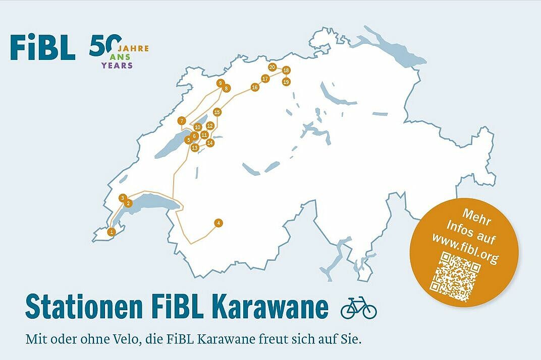 Die Tour startet am 20. August in Genf und endet am 31. August am FiBL in Frick. Es besteht die Möglichkeit, auf Teilstrecken mitzufahren oder – mit Anmeldung – nur an den Betriebsbesichtigungen teilzunehmen. Das FiBL freut sich über zahlreiche Velofahrerinnen und Velofahrer, die die 50 Jahre FiBL Karawane begleiten. Jetzt anmelden über die untenstehenden Links!