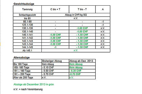 Neu werden erst ab 181 Tagen 30 Rappen pro Kilo Schlachtgewicht in Abzug gebracht. Zwischen 191 bis 200 Tagen beträgt der entsprechende Abzug 70 Rappen. Für ältere Kälber gelten Abzüge nach Vereinbarung. Verbesserungen gibt es auch bezüglich der Gewichtsabzüge.
