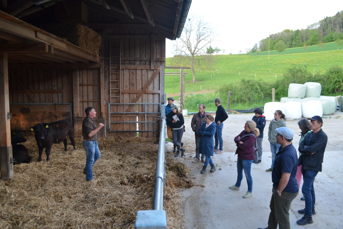 Auf der Stone Ranch begrüsste Betriebsleiter Stefan Schreiber die Gruppe. Unübersehbar war die Begeisterung der Inhaberfamilie für den «Wilden Westen»: das Motto spiegelt sich im Aufbau der Ranch wieder. Seinen Ursprung habe dies in persönlichen Kontakten zu Rinderfarmen in den USA, berichtete Schreiber. Durch die Black-Angus Herde und die Pferdehaltung könnten sie sogar die nötige Infrastruktur für Western-Kurse zur Arbeit mit Pferd und Rindern bereitstellen. Daneben betreibt die Familie Schreiber Ackerbau, einen Hofladen, eine Eventgastronomie und einen Pensionspferdestall.