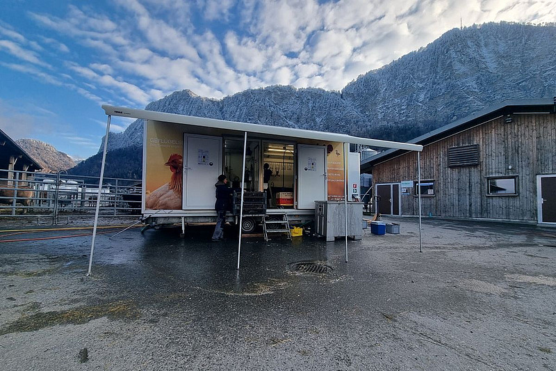 Drei spezialisierte Anbieter ermöglichen die mobile Geflügelschlachtung auf dem Hof – mit Standorten in Graubünden, im Kanton Zürich und neu auch im Kanton Bern. Das Angebot richtet sich insbesondere an Betriebe mit 50 bis 500 Tieren. Ein Schlachtmobil kann pro Tag bis zu 500 Tiere verarbeiten.