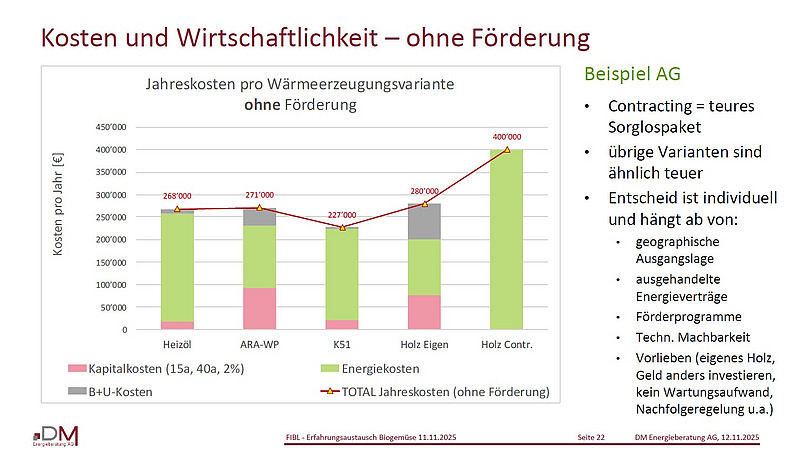 «Holz ist ein träges System, deshalb muss man den Wärmebedarf im Voraus abschätzen und bei extremen Kälteeinbrüchen vorzeitig reagieren», sagte Müller. Wichtig sei auf der anderen Seite auch, immer etwas Reserve im Speicher einzuplanen, denn wenn zu viel Wärme produziert werde, werde es zu heiss im System. Ökonomisch hat sich der Umstieg für Müller gelohnt, bei der Anschaffung erhielt der Betrieb grosszügige Fördergelder und profitiert nun von einem relativ konstanten Holzpreis.