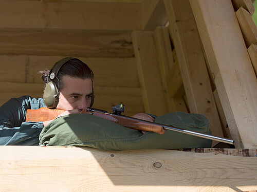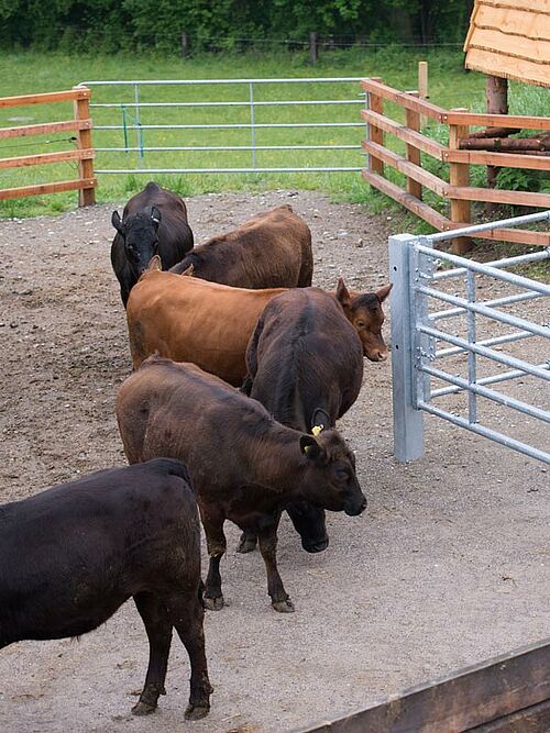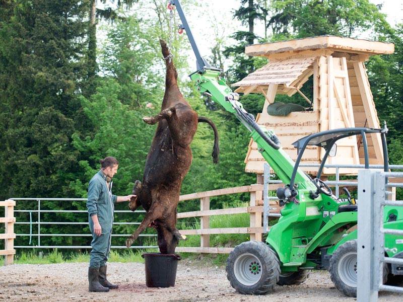 Nils Müller bei seinen Tieren auf der Weide (Fotos: © FiBL, Johanna Probst) Die Gruppe schlachtreifer Tiere im Laufhof neben der Abschusskanzel (Foto: © Gabriela Müller) Der finale Schuss auf eines der Rinder von der Kanzel aus (Foto: © Gabriela Müller) Das betäubte Tier wird mit dem Hoflader hochgehoben (Foto: © Gabriela Müller) Sofortiges Ausbluten des Tieres nach der Betäubung (Foto: © Gabriela Müller) Verladen des toten Tieres in die mobile Schlachtbox (Foto: © Gabriela Müller) Transport des Rindes in der mobilen Schlachtbox (Foto: © Gabriela Müller) Entladen des toten Rindes beim Schlachtlokal (Foto: © Gabriela Müller) Schlachtung des Tieres im Schlachtlokal (Foto: © Gabriela Müller)