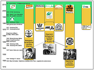 Die Geschichte des Biolandbaus beginnt in den 1920er Jahren. Bis Anfang der 1970er-Jahre prägen einzelne Richtungen und Persönlichkeiten die Biobewegung. Mit der Gründung des Forschungsinstituts für biologischen Landbau (FiBL) (1973) und des Biodachverbands Bio Suisse (1981) setzt eine Institutionalisierung ein. In der untenstehenden Abbildung ist die Entwicklung schematisch dargestellt.