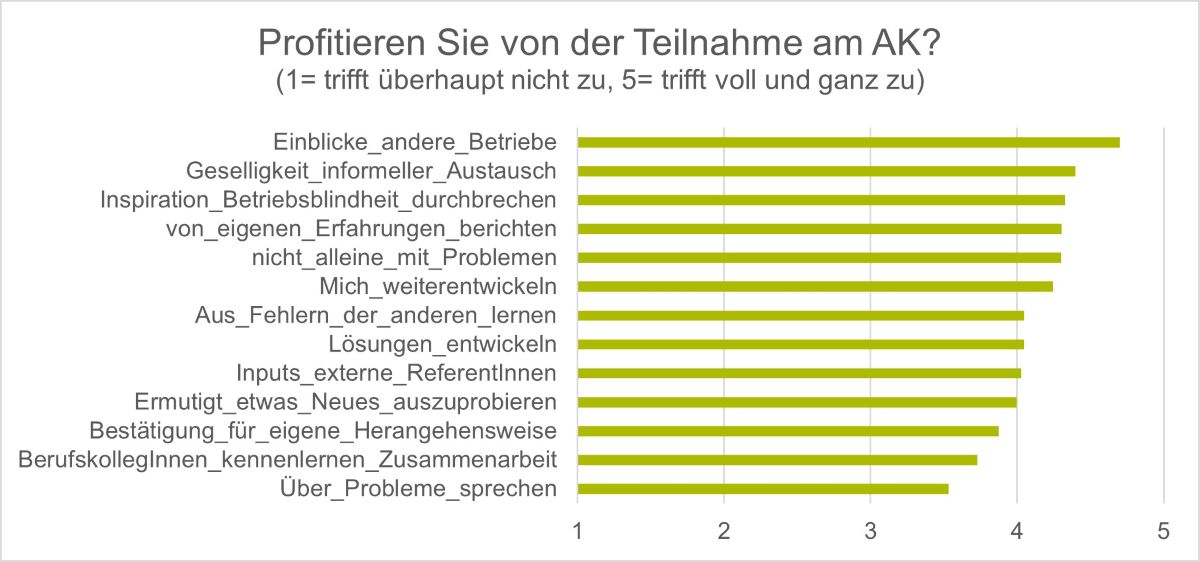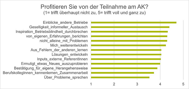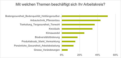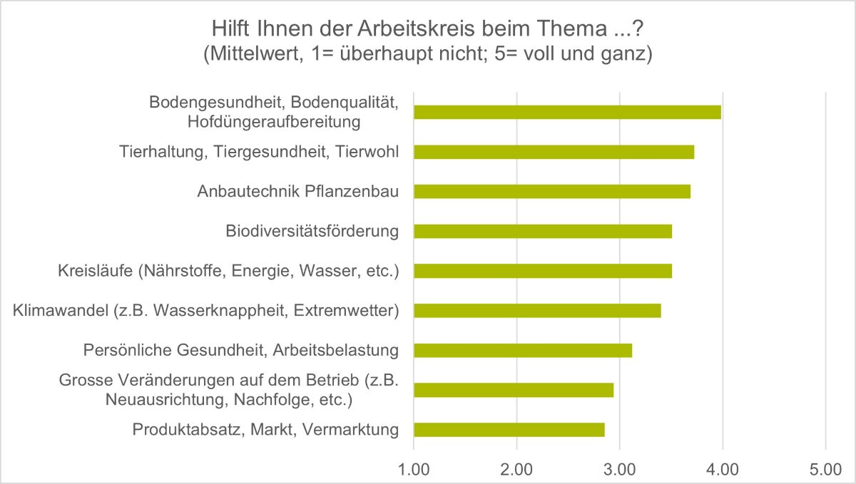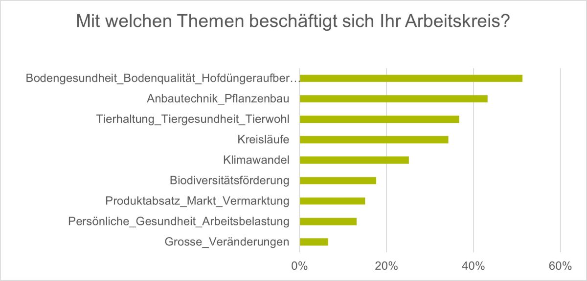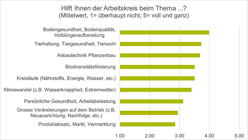 40 Prozent der Befragten gaben an, dass sie von den Gruppen profitieren, weitere 45 Prozent sogar, dass sie sehr stark profitieren. Die Gruppen ermöglichen Einblicke in andere Betriebe, regen zum Umdenken an und schaffen Raum für Erfahrungsaustausch. Besonders wertvoll sind sie bei Themen wie Bodengesundheit, Düngemanagement oder Tierhaltung, Gesundheit und Wohlbefinden der Tiere. Auch Anbautechniken werden intensiv behandelt. Gleichzeitig erfüllen die Gruppen eine wichtige soziale Funktion: Wer auf seinem Betrieb vor grossen Veränderungen steht oder mit gesundheitlichen oder arbeitsbedingten Belastungen kämpft, profitiert am meisten von der Teilnahme. Für die Zukunft zeigt sich, dass wir insbesondere beim Thema Klima und bei der Kreislaufwirtschaft auf den Betrieben mehr Unterstützung bieten sollten.