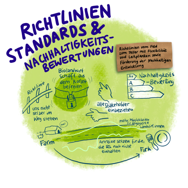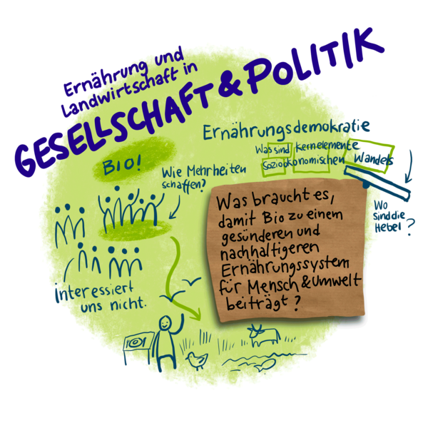 Wie schafft man in einer breiten Bevölkerung das Bewusstsein für den Wert von Nahrungsmitteln und den Wert von landwirtschaftlicher Arbeit? Auf dem Weg zu mehr Biolandwirtschaft und gesellschaftlicher Akzeptanz ist Kommunikation ein Schlüssel, betonte eine Arbeitsgruppe, und zwar nach innen und nach aussen: Man müsse den Menschen näherbringen, «wie die Biowelt funktioniert». Zielkonflikte müsste man erklären können, «auf einfache Art und Weise, und es darf auch einmal witzig sein». In diesem Sinne spürte man den ganzen Tag eine grosse Energie und ein Riesenengagement. Es war spürbar, dass vor allem die Veränderungen weiter verfolgt werden sollten, die für die gesamte Wertschöpfungskette ein Gewinn sind. Man möchte neue Wege einschlagen, diese aber demokratisch legitimiert wissen.