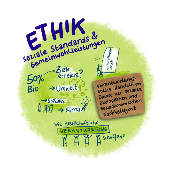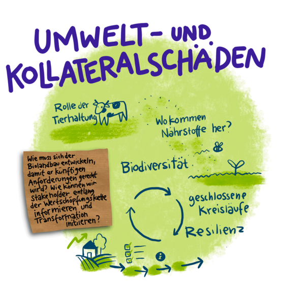 Sind Akteurinnen und Akteuren entlang der Wertschöpfungskette Ernährung und Landwirtschaft eingeladen, um Kernfragen für Forschung und Praxis einer nachhaltigen Landwirtschaft zu entwerfen, dann wird es sofort komplex – aber auch konkret. «Komplex», weil sich zeigte, dass die biologische Landwirtschaft ein Ausgangspunkt ist, um über ökologische Zusammenhänge, wirtschaftliche Entwicklung, ethische Werte und soziokulturelles Zusammenleben nachzudenken. Mit der biologischen Landwirtschaft kommt das Gesamtgefüge unseres Lebens in den Blick, von Arbeit und Ernährung über Soziales und Wohlbefinden hin zu Wissen und Forschung.