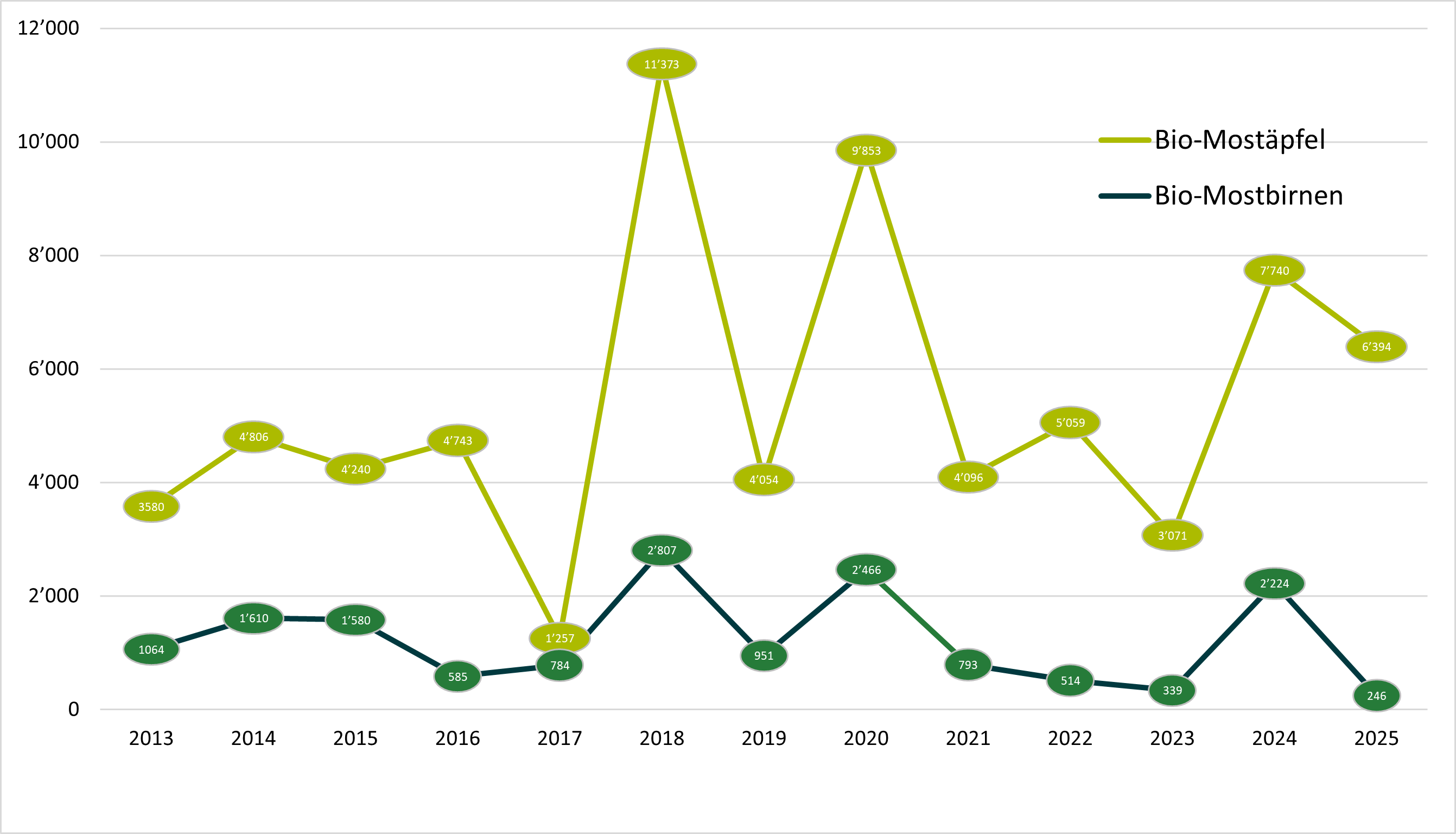 Ende 2025 wurden rund 6'349 Tonnen Biomostäpfel und rund 246 Tonnen Mostbirnen geerntet (Zahlen beziehen sich auf Mengen im Ernteausgleichsystem).