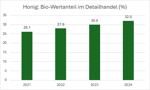 Der Detailhandel verzeichnet in den vergangenen Jahren steigende Absatzmengen. Auch der Bioanteil im Honigsortiment im Detailhandel ist über die letzten Jahre kontinuierlich gewachsen und betrug im Jahr 2024 32%. Trotz steigender Produktionsmengen kann die Nachfrage nicht mit Schweizer Knospehonig allein gedeckt werden und es wird ergänzend importiert, zu grossen Teilen aus Bulgarien.