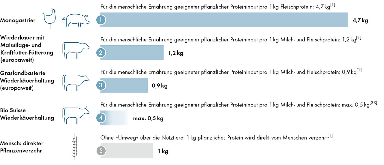 Nur Wiederkäuer wie Rindvieh, Schafe und Ziegen können Grasland für die menschliche Ernährung nutzbar machen. Sie verwandeln pflanzliches Protein aus Gräsern, das Menschen nicht verdauen können, in hochwertiges tierisches Lebensmittelprotein.