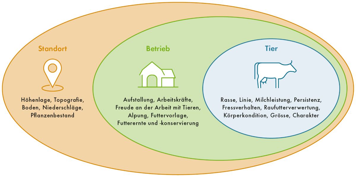 Passende Rassen ermöglichen auf Grasland gute Milchleistungen – mit wenig Kraftfuttereinsatz und mit guter Klimabilanz. In Berglagen bewähren sich robuste Zweinutzungsrassen. Entscheidend ist die standortgerechte Abstimmung von Tier, Betrieb und Futter.