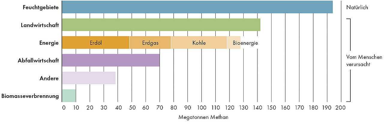 Methan gelangt über verschiedene Quellen in die Atmosphäre. Die wichtigsten sind: