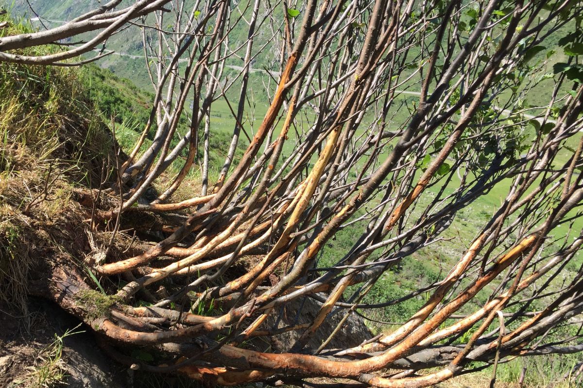 Die Äste werden von den Engadinerschafen entrindet und bis in den Holzkörper verletzt. Das Abnagen führt letztlich zum Tod der Grünerlen. Foto: zVg. Kleinwiederkäuer Forum, Erika Hiltbrunner
