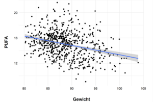 Eindeutige Zusammenhänge zeigen sich zwischen PUFA-Konzentrationen und Schlachtgewichten bzw. MFA-Werten (Magerfleischanteil). Je höher die MFA-Werte, desto höher die PUFA-Werte, da die PUFA bei mageren Tieren mit wenig Fettauflage weniger verdünnt sind. Je höher das Gewicht, desto tiefer der PUFA-Wert, da schwerere Tiere mehr Fett haben und die PUFA dadurch verdünnt sind.