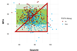 - Hohe Gewichte und mittlere MFA-Werte anstreben: Tiere mit einem höheren Schlachtgewicht haben tiefere PUFA-Werte. Dabei muss ein Optimum mit den MFA-Werten gefunden werden. Finanziell ideal ist eine Kombination aus Schlachtgewicht und MFA-Werten, die innerhalb des roten Dreiecks liegt (siehe Abbildung).